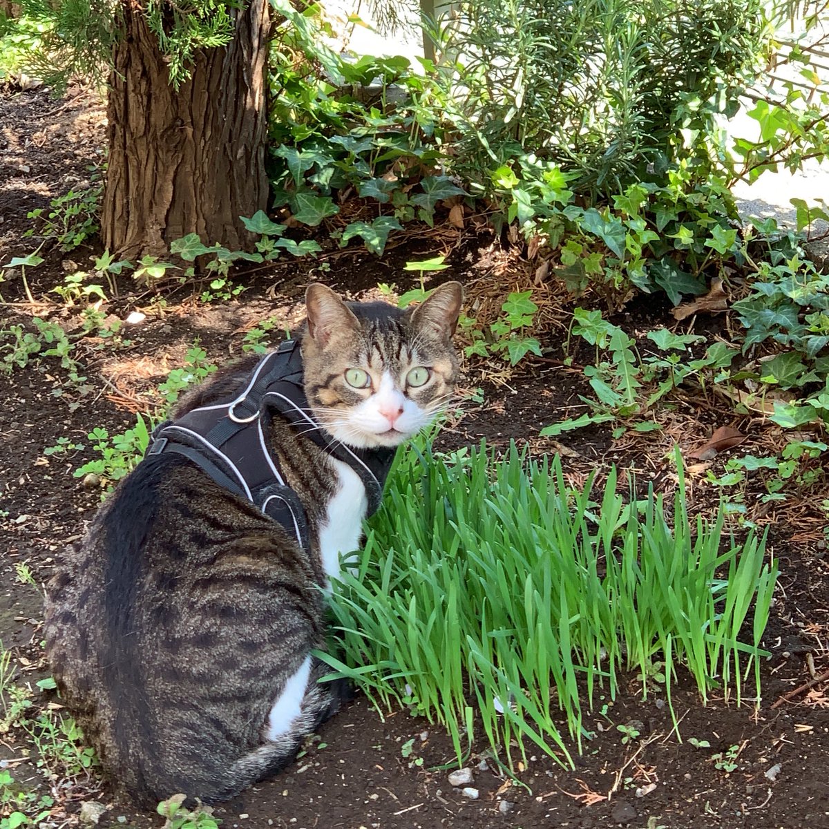 Miyushi 猫草は庭に植えた方が元気だと判明 口につけたまま気付いてないのがかわいい